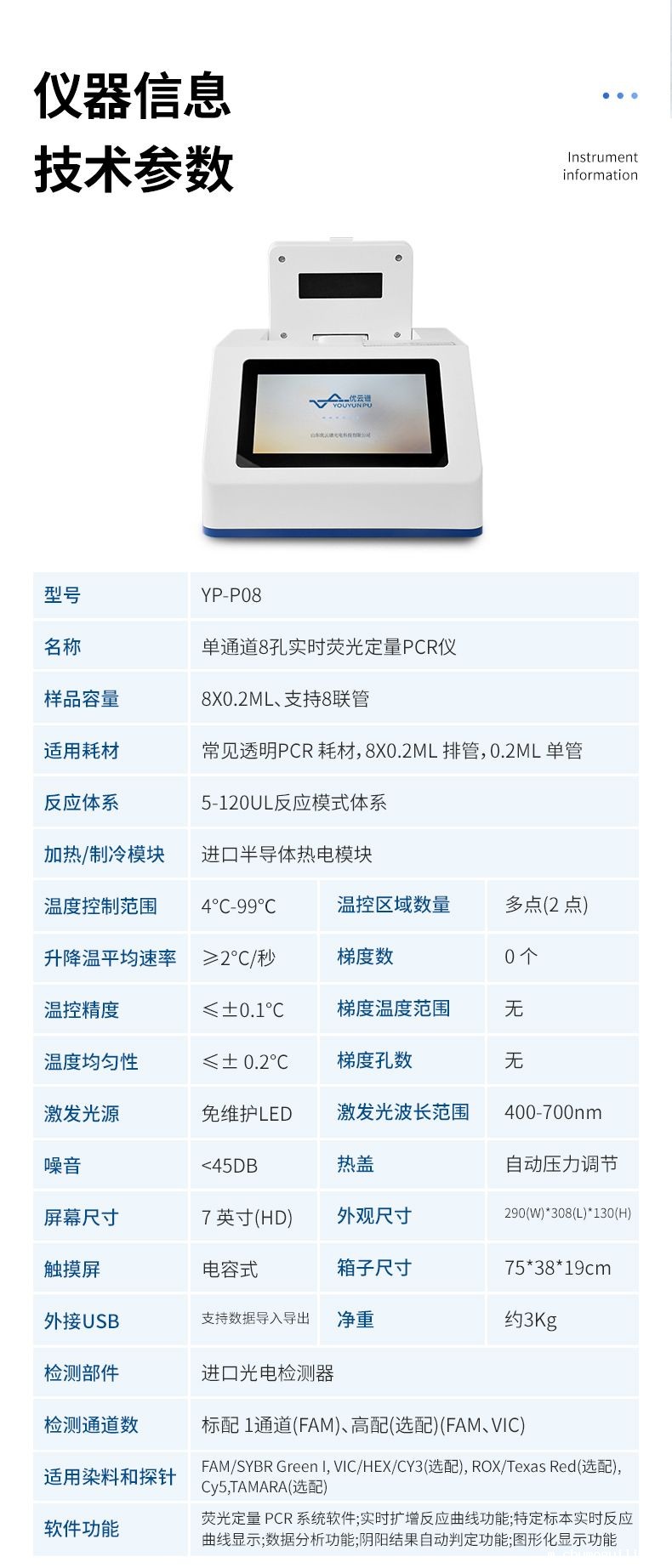 YP-P08型基因扩增仪主要用于运行实时荧光定量PCR实验,通过荧光激发和采集的方式,对实验过程进行实时监控,将实验过程数据绘制成荧光曲线,实时呈现于仪器显示界面,并对实验数据进行拟合和分析,最后可生成PDF格式的实验报告。